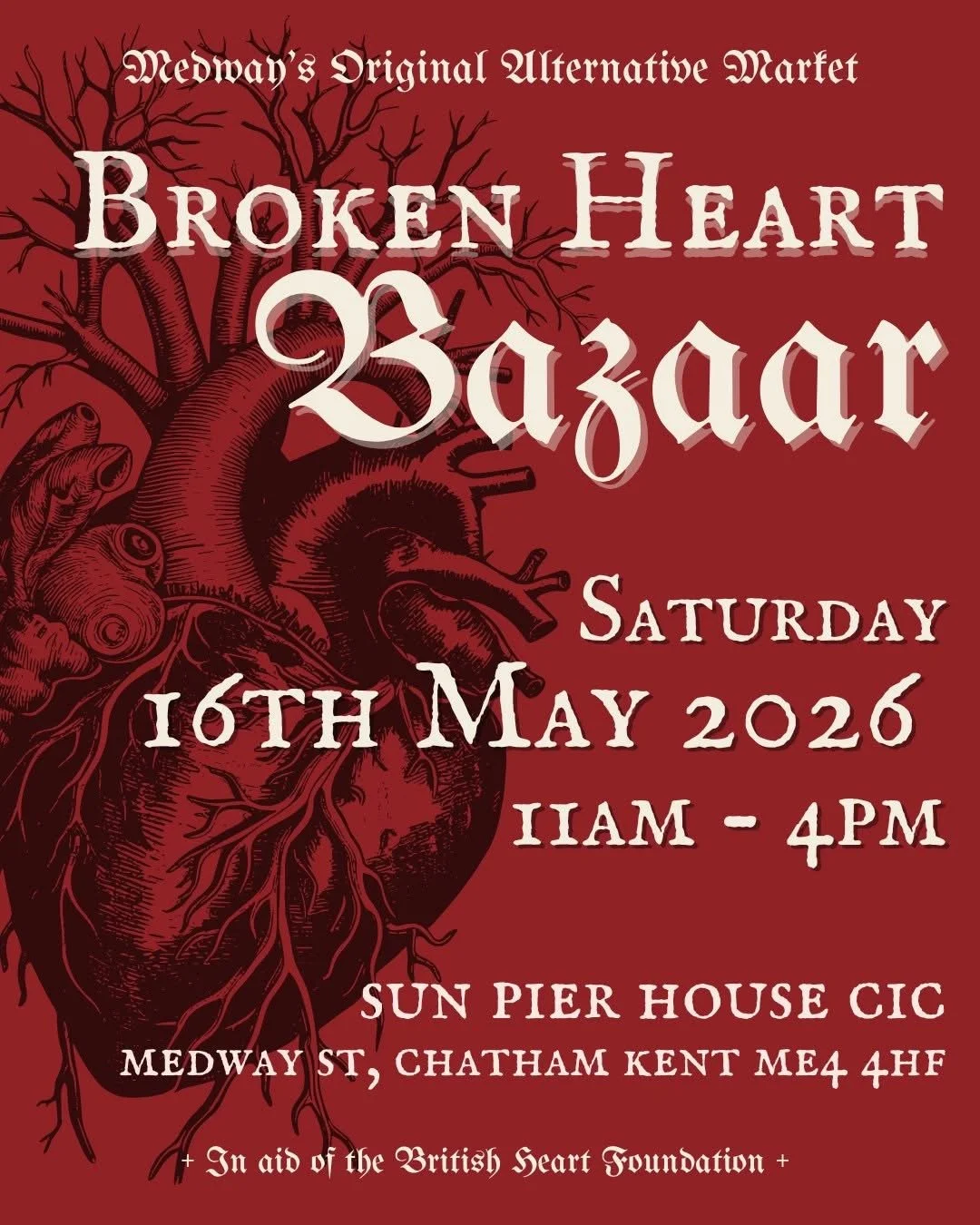 Your original Medway alternative market returns! Join us for another unique blend of alternative art, curios and wonders, gothic gifts, spooky homewares, and terrifying trinkets for you to explore! Not just any alternative market, this one has real heart. We run in aid of the British Heart Foundation and so far our events have raised more than £6000 for this incredible charity. With more than 40 incredibly talented makers bringing you their best works you are bound to leave with a haul of the best alternative goodies money can buy. No Ai slop or reselling allowed - our traders and artists are selected for the highest quality, human-made art. The venue is dog friendly! Lots of nearby parking options as well. Well-behaved children are welcome, but please be aware that some of the art and wares available are of a mature nature.